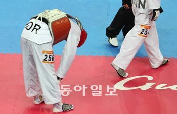 태권도 종주국의 체면이 말이 아니게 됐다. 광저우 아시아경기 태권도 경기 첫날인 17일 한국은 3명이 출전해 두 명은 1회전에서 탈락하고 한 명은 은메달을 땄다. 한 개의 금메달도 따지 못하면서 한국은 남녀 6체급씩 총 12개 종목에서 8개의 금메달을 딴다는 목표 달성이 어려울 것으로 보인다. 4년 전 도하 대회 때는 금메달 9개를 수확했다.