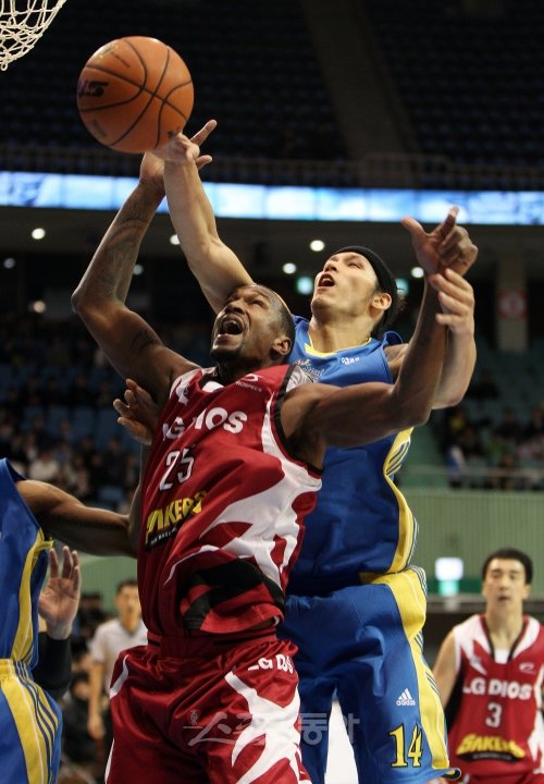 9일 오후 서울 잠실실내체육관에서 열린 프로농구 2010-2011 서울 삼성 썬더스와 창원 LG세이커스의 경기에서 삼성 이승준과 LG 커밍스가 리바운드볼을 다투고 있다.