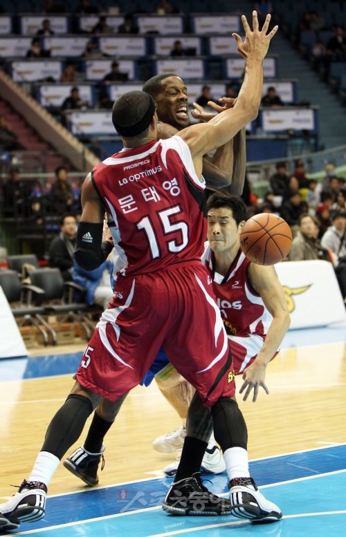 9일 오후 서울 잠실실내체육관에서 열린 프로농구 2010-2011 서울 삼성 썬더스와 창원 LG세이커스의 경기에서 삼성 헤인즈가 LG 문태영의 마크에 볼을 놓치고 있다.