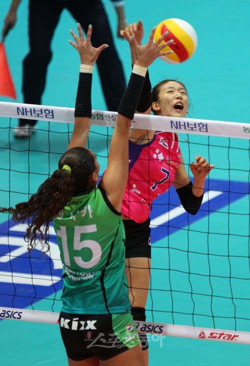 15일 인천도원시립체육관에서 여자 프로배구 ‘NH농협 2010∼2011 V리그’흥국생명과 GS칼텍스의 경기. 흥국생명 김혜진이 GS 김혜선의 수비를 피해 공격하고 있다.