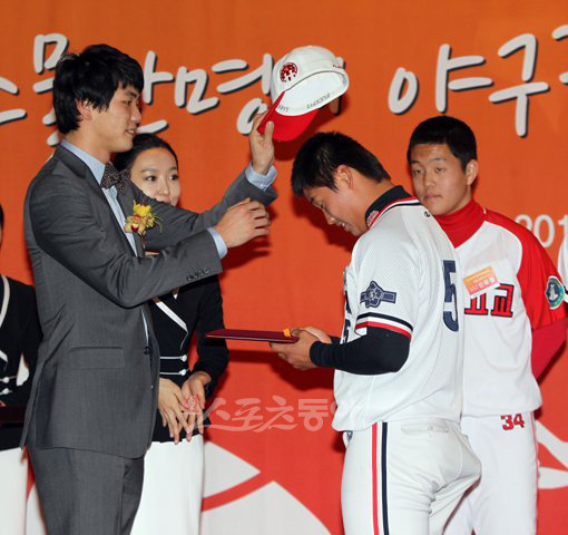 23일 오전 서울 광진구 쉐라톤 워커힐 코스모스홀에서 열린 제1회 SK 야구 꿈나무 장학금 전달식에서 SK와이번스의 김광현이 고등부 시상자들에게 멘티 회원 증서와 모자를 전달하고 있다.