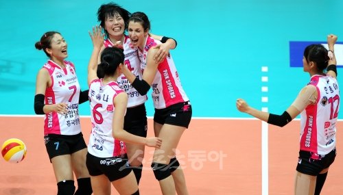 27일 인천 도원체육관에서 열린 여자 프로배구 ‘NH농협 2010∼2011 V리그’흥국생명과 인삼공사의 경기에서 3대 1로 승리한 흥국생명 선수들이 기쁨을 나누고 있다.