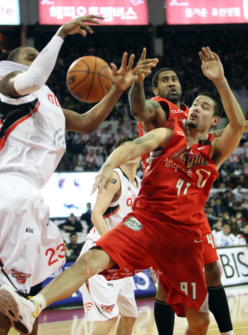 9일 오후 서울 잠실학생체육관에서 열린 2010-11 시즌 현대 모비스 프로농구 서울 SK 나이츠와 부산 KT 소닉붐의 경기에서 SK 김민수와 KT 존슨(왼쪽)이 리바운드볼을 다투다 볼을 놓치고 있다.
