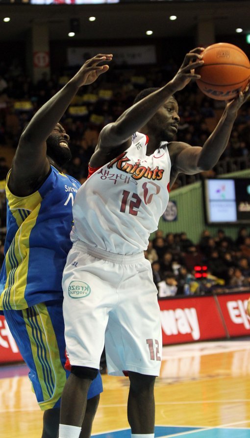 20일 서울 잠실실내체육관에서 열린 2010-2011 현대모비스 프로농구 서울삼성과 서울SK의 경기에서 SK의 레더와 삼성의 딕슨이 리바운드볼을 다투고 있다.
