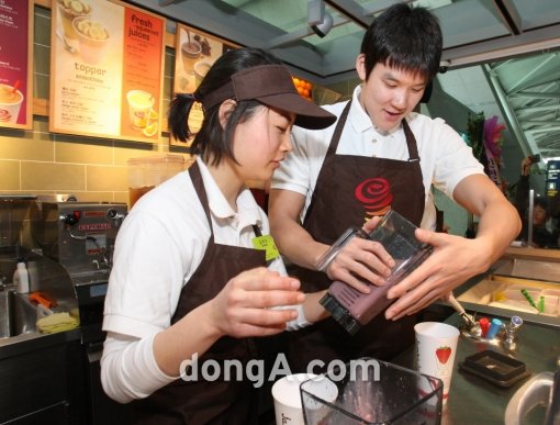 ‘마린보이’ 박태환(22·단국대)이 28일 인천국제공항에 있는 미국 스무디 브랜드 ‘잠바주스’에서 일일 점장 체험을 했다.