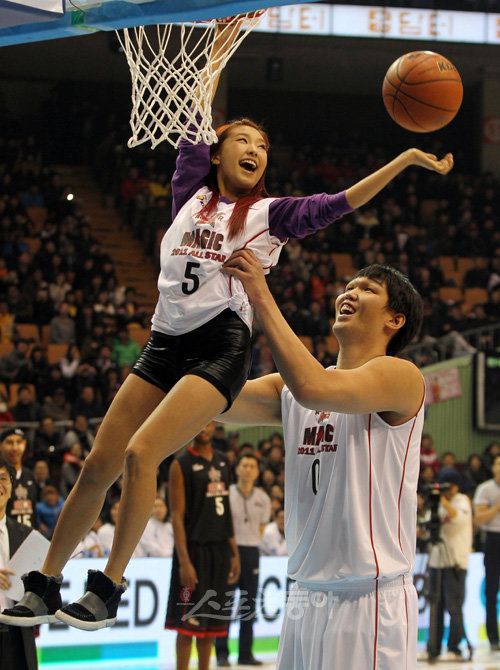30일 오후 서울 잠실실내체육관에서 열린 2010-2011 현대모비스 프로농구 올스타전에서 씨스타 보라가 하승진의 도움을 받아 시구를 하고 있다.