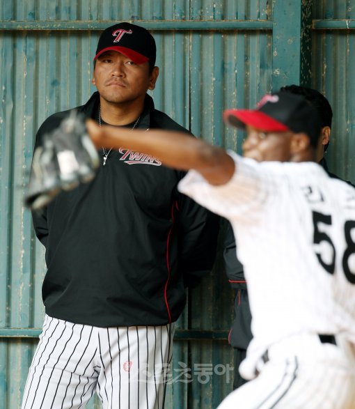명 마무리 투수로 이름을 날렸던 사사키 가즈히로가 스프링캠프 인스트럭터 자격으로 오키나와 LG 캠프를 방문해 투수들의 피칭을 유심히 지켜보고 있다.
