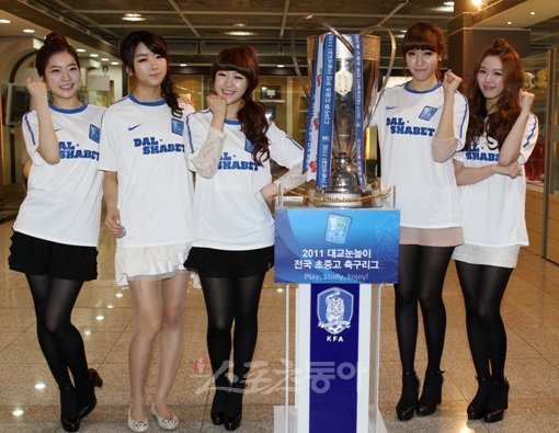 10일 오후 서울 종로구 신문로 축구회관 대회의실에서 열린 '달샤벳 전국초중고축구리그 홍보대사 위촉식'에서 신예 6인조 걸그룹 달샤벳에의 멤버 아영, 수빈, 지율, 비키, 세리(왼쪽부터)가 전국초중고축구리그 트로피 앞에서 포즈를 취하고 있다.