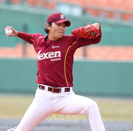 18일 오후 부산 사직구장에서 열린 프로야구 롯데 자이언츠와 넥센히어로즈의 시범경기에서 넥센 선발 김성태가 역투하고 있다.