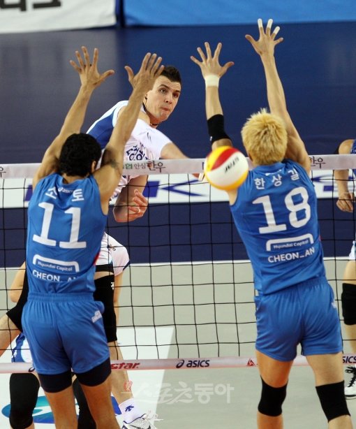 24일 오후 천안 유관순체육관에서 열린 프로배구 10-11V리그 현대캐피탈과 삼성화재의 플레이오프 2차전 경기에서 삼성화재 가빈이 수비벽을 뚫고 있다.