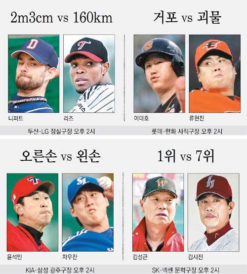 LG의 4강 숙원을 풀어줄 해결사의 중책을 짊어진 레다메즈 리즈는 시범경기에서 벌써 역대 한국 프로야구에서 가장 빠른 시속 160km를 던졌다. 변화구와 제구력도 합격점을 받았다. 지난달 24일 롯데와의 시범경기에서 157km를 던지고도 “날씨가 추워 스피드가 덜 나왔다”던 그가 얼마나 더 빠른 공을 던질지 관심거리다. ○ 이대호(롯데) vs 류현진(한화)