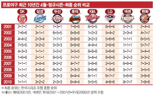1989년부터 지난해까지 4월 1위가 최종 1위를 차지한 경우는 1993년 해태부터 지난해 SK까지 모두 10차례 나왔다. 20시즌 중 10시즌, 즉 50%의 확률을 자랑했다. 4월 1위가 정규시즌을 1위로 마친 경우도 모두 12차례여서 60%의 확률을 보였다. 특히 2003∼2004년 현대, 2005년 삼성, 2007∼2008년과 2010년 SK는 4월 1위의 여세를 몰아 페넌트레이스를 1위로 마친 뒤 한국시리즈까지 제패하는 ‘무결점 우승’을 달성했다.