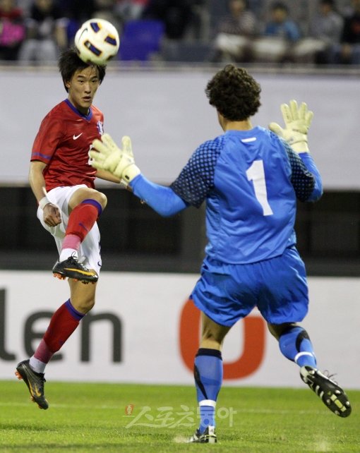 8일 오후 7시 수원종합운동장에서 열린 ‘제5회 수원컵 U-20 축구대회’ 한국과 뉴질랜드의 경기에서 한국 남승우가 뉴질랜드 골키퍼 스데판 마리노빅의 키를 넘기는 슛을 시도하고 있다.