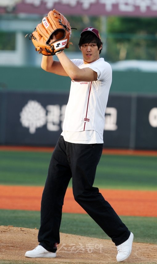 13일 서울 목동야구장에서 열린 '2011 프로야구' LG 트윈스와 넥센 히어로즈의 경기에서 골리앗 하승진(KCC)이 시구하고 있다.