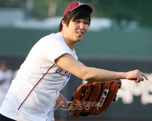 13일 서울 목동야구장에서 열린 '2011 프로야구' LG 트윈스와 넥센 히어로즈의 경기에서 골리앗 하승진(KCC)이 시구하고 있다.