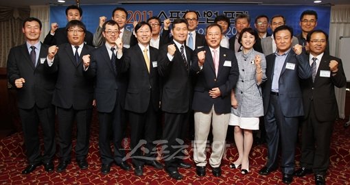 18일 오후 서울 송파구 방이동 올림픽파크텔에서 열린 '종편 출범에 따른 스포츠 콘텐츠 가치 증대 방안'을 주제로 한 '제46회 스포츠산업포럼 2011'에서 참석 내외 귀빈들이 기념촬영을 하고 있다. 김창율 스포츠코리아 대표, 김창호 (사)한국스포츠산업협회 포럼위원장, 조수연 육영재단 이사장, 민국홍 스포티즌 대표, 김종 한양대 교수, 한남희 조이포스 대표, 임병태 2014 인천아시안게임조직위 홍보보좌관, 박기철 (주)스포츠투아이 전무, 정철의 (주)FMG 부회장, 서천범 한국레저산업연구소장, 오정석 (주)싸카 대표, 이홍석 한양대 교수, 원영신 연세대 교수, 이관식 (주)올림픽콜로세움 대표, 배재성 KBS 위원, 손장환 jTBC 부국장, 윤석민 서울대 교수, 금현창 네이버 스포츠서비스 팀장(왼쪽 아랫줄부터 시계방향으로)
