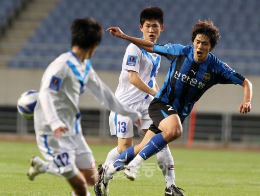 18일 오후 인천월드컵경기장에서 열린 2011 하나은행 FA컵 전국축구선수권대회 32강전에서 인천 유준수가 상대 수비수를 피해 패스하고 있다.