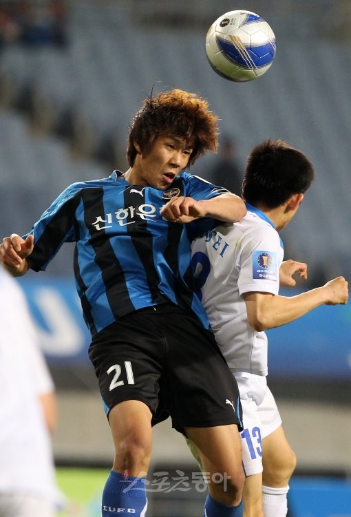 18일 오후 인천월드컵경기장에서 열린 2011 하나은행 FA컵 전국축구선수권대회 32강전에서 인천 유준수가 연세대 김도혁을 피해 헤딩슛을 시도하고 있다.