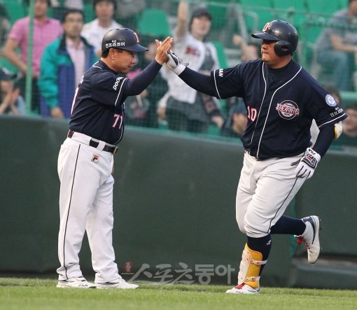 1일 인천 문학야구장에서 열린 프로야구 두산 베어스와 SK 와이번스의 경기에서 4회초 두산 공격, 2사 2루 상황에서 두산 최준석이 투런을 친 후 3루 코치와 하이파이브를 하고 있다.