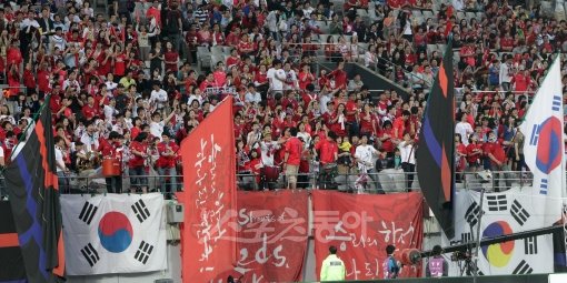 3일 오후 8시 서울월드컵경기장에서 열린 한국 축구대표팀과 세르비아의 평가전 경기에서 붉은악마들이 응원전을 펼치고 있다.