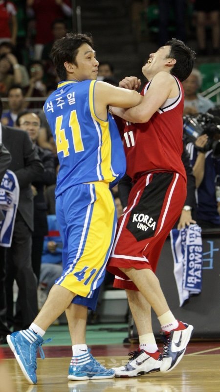 26일 오후 3시 서울 잠실학생체육관에서 1990년대 대학농구의 전성시대를 이끈 양대 산맥 고대-연대 농구 OB팀 추억을 라이벌 전을 가졌다. 연대 석진욱(왼쪽)이 고대 양희승을 마크하고 있다.