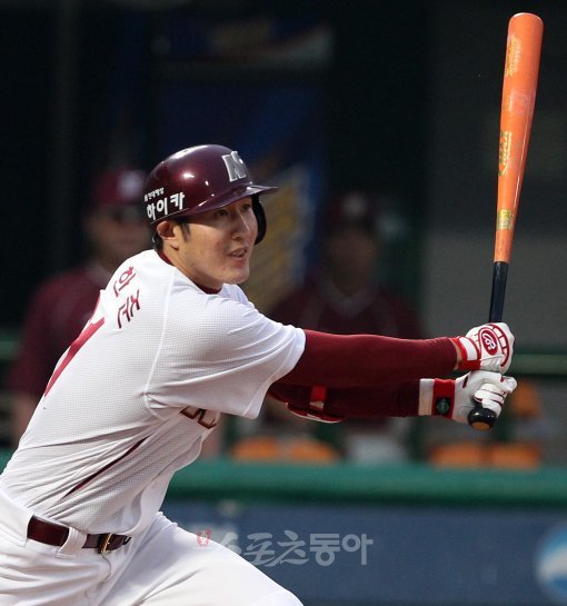 28일 서울 목동야구장에서 열린 프로야구 두산 베어스와 넥센 히어로즈의 경기에서 3회초 넥센 공격, 2사 1,3루 넥센 유한준이 1타점 적시타를 치고 있다.