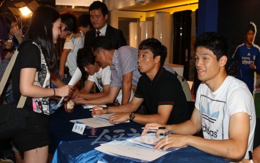 17일 오후 서울 서초구 삼성전자 사옥 홍보관에서 수원삼성의 홈구장인 수원월드컵경기장(애칭 빅버드) 사용 10주년 기념행사가 열렸다. 수원 삼성 정성룡(앞)과 염기훈이 사인을 하며 밝게 웃고 있다.