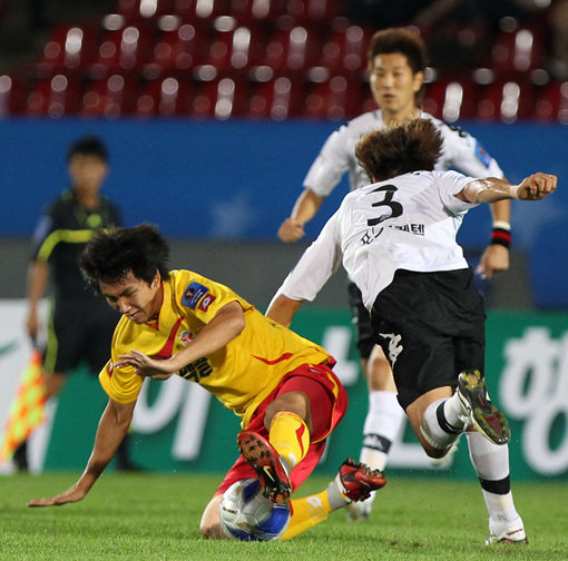 24일 경기도 성남 탄천종합운동장에서 하나은행 FA컵 준결승전 4강전 성남일화와 포항스틸러스의 경기가 열렸다. 전반전 성남 조동건과 포항 김광석이 볼을 치열하게 다투고 있다.