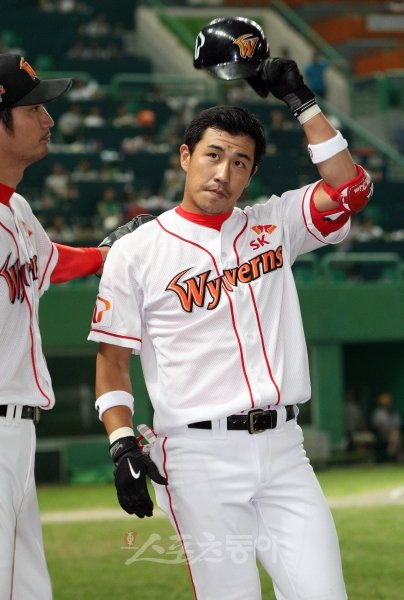 24일 인천 문학야구장에서 열린 ‘2011 롯데카드 프로야구’ SK와 두산의 경기에서 3회말 두산 공격, 2사 2루 상황에 김강민이 투런포를 때려낸 뒤 환호하는 팬들을 향해 헬멧을 들어보이고 있다.