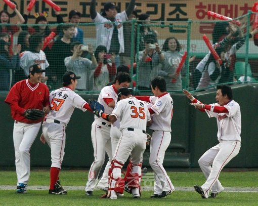 11회말 SK 공격, 2사 만루상황에서 SK는 이호준의 중전안타로 3 대 2로 한점차 승리했다. 이호준이 동료들의 축하를 받고 있다.