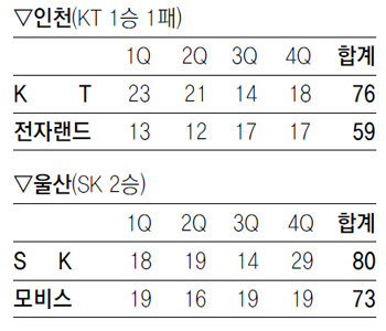 인천에서 2위 KT는 찰스 로드(30득점)를 앞세워 전자랜드를 76-59로 꺾고 10승 5패를 기록해 선두 동부를 2.5경기 차로 쫓았다.
