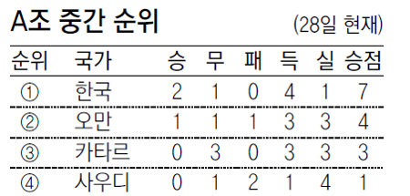 28일 열린 2012년 런던 올림픽 축구 아시아 지역 최종 예선 3차전에서 A조의 오만과 카타르가 1-1로 비겼다. 27일 사우디아라비아를 1-0으로 꺾은 한국은 승점 7점(2승 1무)으로 오만(승점 4점·1승 1무 1패)과 격차를 벌리며 선두를 지켰다. 카타르는 3무승부(승점 3점)로 3위를 유지했다. 사우디아라비아는 1무 2패(승점 1점)로 최하위에 머물렀다. 오만은 이날 경기에서 전반 11분 압둘 아지즈 알 마크발리가 선제골을 넣었으나 후반 43분 카타르의 파드 알불루시 칼판에게 동점골을 허용했다.