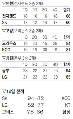 전자랜드는 인천 안방경기에서 SK를 68-60으로 꺾었고, 오리온스는 KCC에 84-81로 역전승을 거뒀다. 전날 삼성을 완파한 6위 모비스는 7위 SK와의 승차를 다시 2경기로 벌렸다.