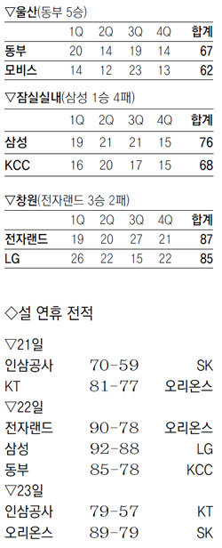 신흥 명장의 반열에 올라선 강 감독이 이끄는 동부는 정규시즌 우승 매직 넘버를 ‘7’로 줄였다. 동부는 베스트5 전원이 10점 이상을 넣는 고른 공격력을 펼쳤다. 강력한 최우수선수 후보인 동부 윤호영은 3점슛 4개를 적중시키며 14점을 넣었다.