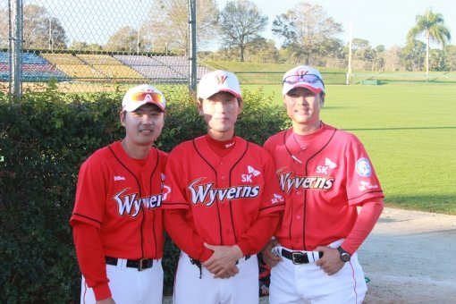 직구구속이 시속 130km대 중반에 불과했지만, 빼어난 완급조절로 타자들을 요리했던 직구구속이 시속 130km대 중반에 불과했지만, 빼어난 완급조절로 타자들을 요리했던 SK 성준(가운데) 코치. 그는 긴 인터벌 때문에 ‘만만디’라는 별명으로 더 유명했지만, 역대 좌완통산승수에서 2위(97승)에 오를 만큼 뛰어난 성적을 기록하기도 했다. 미국 플로리다에서 전지훈련 중인 성 코치가 김원형(왼쪽), 조웅천 코치와 함께 미소를 짓고 있다. 사진제공 | SK 와이번스