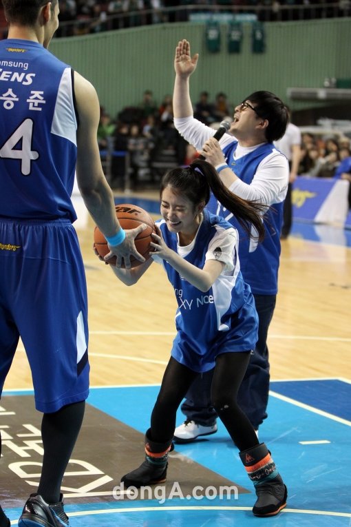 ‘국민요정’ 아이유가 11일 오후 잠실실내체육관에서 열린 프로농구 서울 삼성과 원주 동부의 경기에서 앞서 시투자로 나서 슛을 힘차게 쏘다 중심을 잃고 넘어지고 있다.