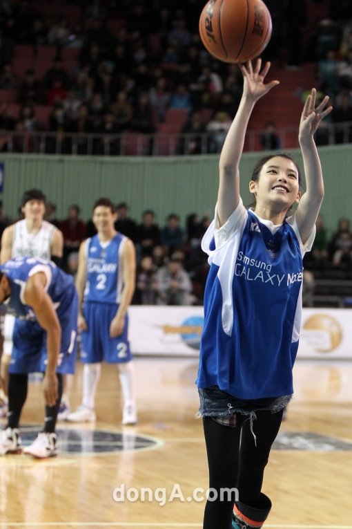 ‘국민요정’ 아이유가 11일 오후 잠실실내체육관에서 열린 프로농구 서울 삼성과 원주 동부의 경기에서 앞서 시투자로 나서 슛을 힘차게 쏘다 중심을 잃고 넘어지고 있다.