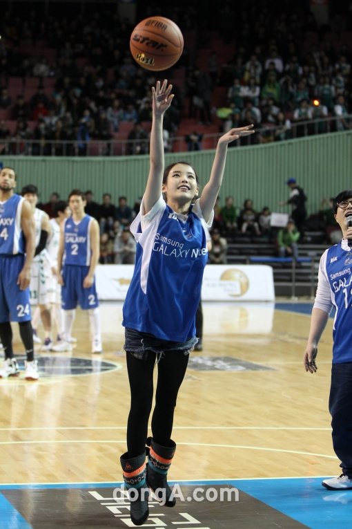‘국민요정’ 아이유가 11일 오후 잠실실내체육관에서 열린 프로농구 서울 삼성과 원주 동부의 경기에서 앞서 시투자로 나서 슛을 힘차게 쏘다 중심을 잃고 넘어졌다.