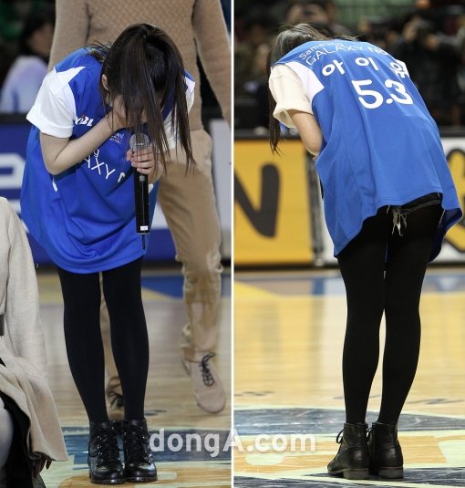 이날 검은 타이즈에 청반바지를 입은 아이유가 하프타임 때 삼성 유니폼 상의을 입고 다시 코트에 올라 ‘좋은날’과 ‘너랑나’ 두 곡을 열창했다.