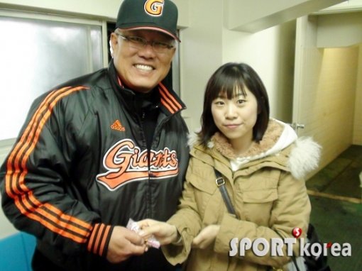 발렌타인데이인 14일 일본 가고시마에서 전지훈련중인 롯데 양승호 감독(왼쪽)이 미모의 여성팬으로부터 초콜릿을 선물 받고 행복한 미소를 짓고 있다.