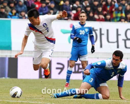 25일 오후 전주월드컵경기장에서 열린 대한민국 대 우즈베키스탄의 경기에서 후반전 대한민국 김두현이 상대 수비수의 발에 걸려 넘어지고 있다.