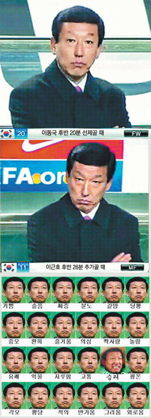‘최강 무표정.’ 지난달 29일 2014년 브라질 월드컵 아시아지역 3차 예선 쿠웨이트와의 경기를 2-0 승리로 이끈 최강희 한국 축구대표팀 감독의 무표정한 얼굴이 인터넷에서 화제다. 예상 밖의 고전을 하다 후반 20분 이동국의 선제골이 터졌는데도 그는 입을 굳게 다문 채 먼 산 쳐다보듯 표정에 아무런 변화가 없다. 후반 26분 이근호가 두 번째 골을 넣었을 때는 턱을 당긴 채 눈을 치켜 뜬 표정이 오히려 뭔가 불만이 있는 듯이 보인다. 누리꾼이 최 감독의 표정을 24가지 감정 표현으로 분류해 놨지만 아무리 봐도 그 표정이 그 표정이다. 딱 하나 구분되는 얼굴은 ‘승리’했을 때뿐이다. 이 표정은 최 감독이 전북을 이끌던 지난해 12월 4일 울산과의 챔피언 결정 2차전 승리로 K리그 정상을 차지한 뒤 이를 드러내며 활짝 웃고 있는 모습이다.