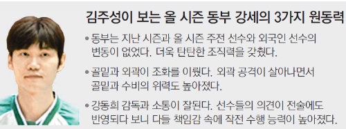 김주성은 “운이 좋아 큰 부상이 없었다”면서도 “지난 시즌 챔피언결정전에서 아깝게 패했기 때문에 더 노력했다. 우리 외곽 슈터들이 좋아져서 골밑 부담이 줄어든 영향도 있다”고 분석했다. 지난 시즌 31.2%로 리그 최하위였던 동부의 3점슛 성공률은 이번 시즌 36.5%로 리그 1위를 달리고 있다. 외곽 열세로 골밑에서 상대 수비의 집중 견제 속에 공격 시도가 잦았던 예전과 달리 한결 숨통이 트였다는 게 김주성의 얘기.