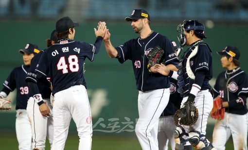기록했다. 끝까지 직접 경기를 마무리한 니퍼트가 마운드에서 동료들과 하이파이브로 기쁨을 나누고 있다. 사직|김민성 기자