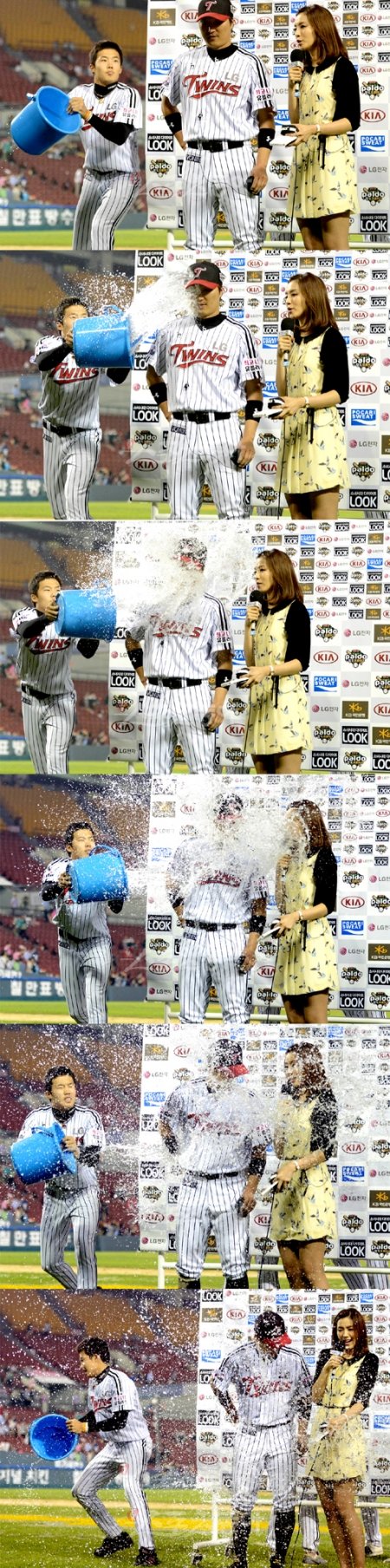 LG 이진영이 KBS N 정인영 아나운서와 인터뷰를 하는 가운데 임찬규가 물세례를 날리고 있다.