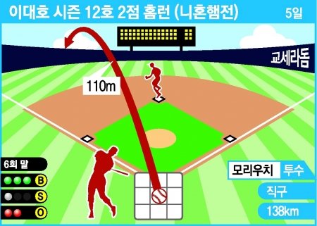 첫 타석에서 우익수 뜬공으로 물러난 이대호는 2번째 타석에서 좌중간 안타로 타격감을 조율한 뒤 1-4로 뒤진 6회 2사 2루서 상대 2번째 투수 모리우치 도시하루의 직구를 받아쳐 좌중간 펜스를 훌쩍 넘겼다. 시속 138km짜리 한복판 직구를 놓치지 않고 막힘없이 잡아당겼다. 4번째 타석에선 2루 땅볼에 그쳤다.
