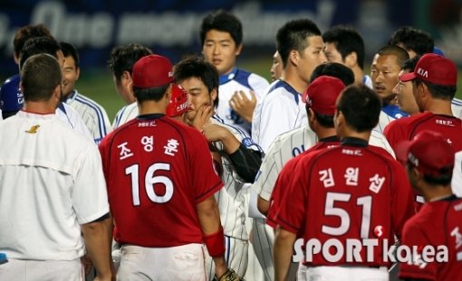 `2012 팔도 프로야구` 삼성 라이온즈와 KIA 타이거즈의 경기가 15일 오후 대구 시민야구장에서 열렸다. 7회말 무사에서 삼성 6번 진갑용이 KIA 박지훈에게 사구를 맞고 벤치 클리어링이 일어나자 삼성 박석민이 KIA 김평호 코치와 장난을 치고 있다.