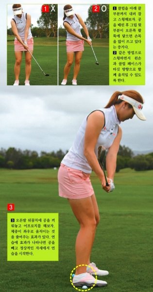 오른발 뒤꿈치에 공을 끼워놓고 그 상태에서 어프로치를 해보자. 체중이 오른쪽에서 왼쪽으로 이동되는 현상을 줄여준다. 이 연습이 익숙해지면 공을 빼고 연습한다.