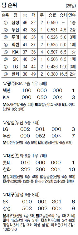 KIA는 광주에서 넥센을 3-1로 이겼다. KIA 최향남은 9회 넥센 중심 타선인 박병호(삼진)-강정호(3루수 땅볼)-이성열(삼진)을 깔끔하게 제압하며 역대 최고령(41세 3개월 27일) 세이브 투수가 됐다. 종전 기록은 2007년 송진우 한화 투수코치가 세운 41세 3개월 15일이다. 두산은 서울 라이벌 LG에 7-3으로 역전승하며 69일 만에 2위로 뛰어올랐다.