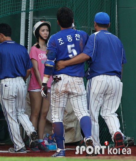 `2012 팔도 프로야구` 롯데 자이언츠와 삼성 라이온즈의 경기가 3일 오후 부산 사직야구장에서 열렸다. 롯데 배트걸 신소정이 2회초 무사 1루에서 롯데 선발 고원준의 투구를 얼굴에 맞고 응급처치를 받기 위해 그라운뜨를 빠져 나가는 삼성 조동찬을 걱정스러 눈빛으로 바라보고 있다.